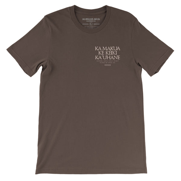 The Kahikolu (Three in one) Tee is inspired by hīmeni Ho‘onani, and a representation of the trinity. Ka Makua (Father), ke Keiki (Son) and ka ‘Uhane (Holy Spirit).